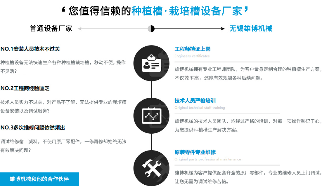 您在選擇雄博產品的同時,也選擇無微不至的終身服務??筛鶕煌蛻魧嶋H需求進行種植槽設備,栽培槽設備等的特殊工藝設計制造專業一對一售前/售后/技術咨詢指導,享受更貼心/放心的設備使用體驗。